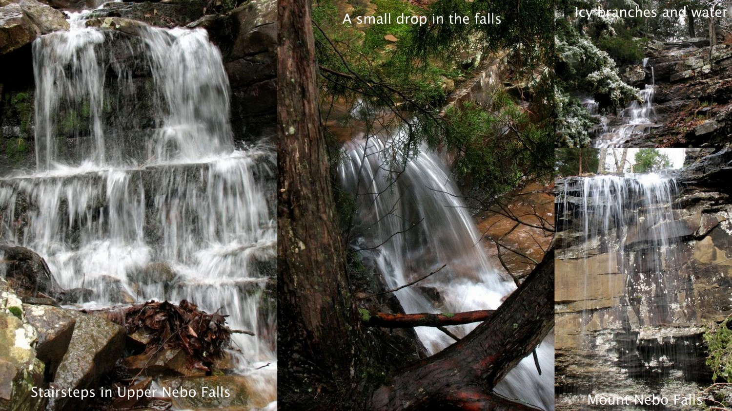 The Waterfall Trail leads past one pretty falls, Upper Nebo Falls, on its way to the main drop, Mount Nebo Falls. Since both are near the top of the mountain the water flow can be low during much of the year, but they are pretty in the early Spring. The collage above was made from pictures I took of the waterfalls during our visit in March, 2009.