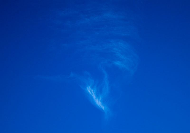 If you watch the skies often enough, you will see all kinds of fascinating things. I captured this wispy cloud in a brilliant October sky last year. It wasn’t a part of a larger cloud formation, but just seemed to be suspended in the sky. I thought it was both interesting and pretty.