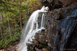 But I’m happy to report that earlier in the day I still felt young enough to do some bushwhacking in Blackwater Falls State Park in West Virginia. Betsy went with me to this pretty cascade on Falls Run, and then she sat guard on a ‘sitting rock’ while I bushwhacked to two waterfalls further down the run. Both were very pretty.