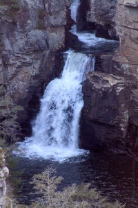 We couldn’t see the main falls from the upper falls, so we decided to hike to an overlook about half a mile away which offered a distant view of the main falls. I had to use my long lens to get the above photo. There is a small, twisting gorge (‘The Chimney’) between the upper and main falls. You can see the water flowing from the bottom of the chimney before reaching the main falls.