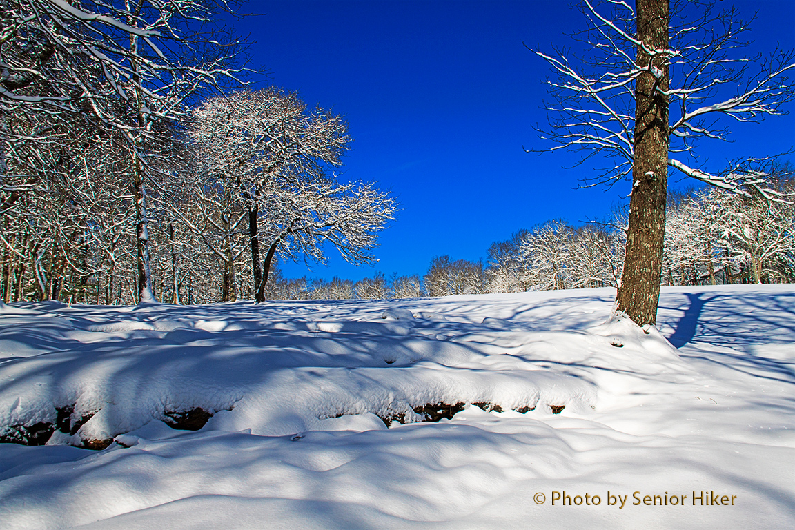 The sky cleared a little later in the morning, so we went for a walk. The contrast between the blue sky and white snow was absolutely gorgeous. This photo looks up the fairway from behind our house.