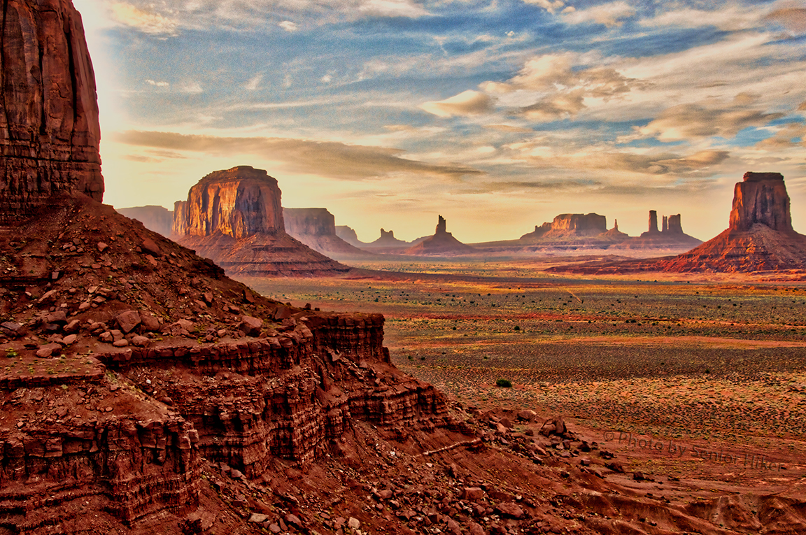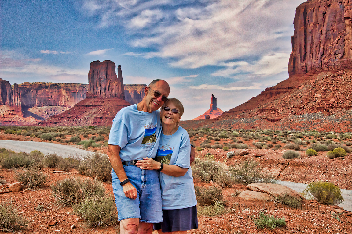 A highpoint of our trip out west in 2017 was our visit to Monument Valley. We had never seen this beautiful place before (except in movies) and we were amazed by the beauty of the place. It took the picture above of the two of us at a pullover along Valley Drive. That’s West Mitten Butte to the left of us with East Mitten in the far background. A part of Merrick Butte is on the right of the photo.