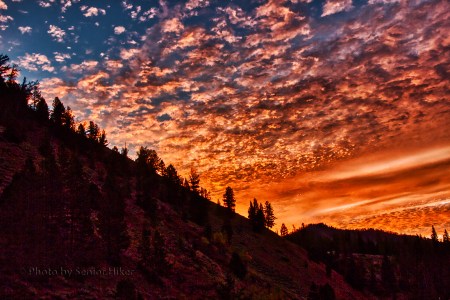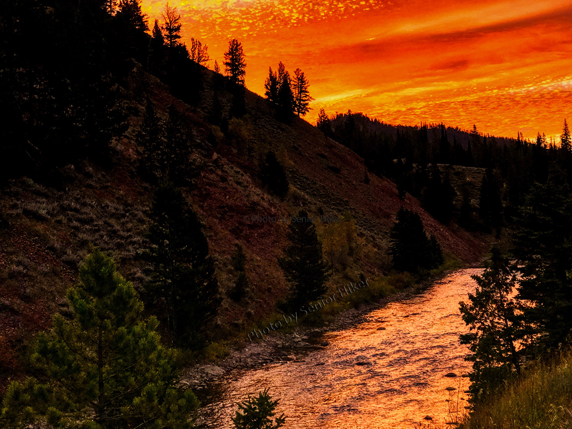 The sun started to rise about the time we reached the Hoback Canyon. Although we couldn’t see the sun, the clouds in the sky above us turned a brilliant crimson. When we rounded a curve we could see the sky reflected in the Hoback River (above) so of course we had to stop.