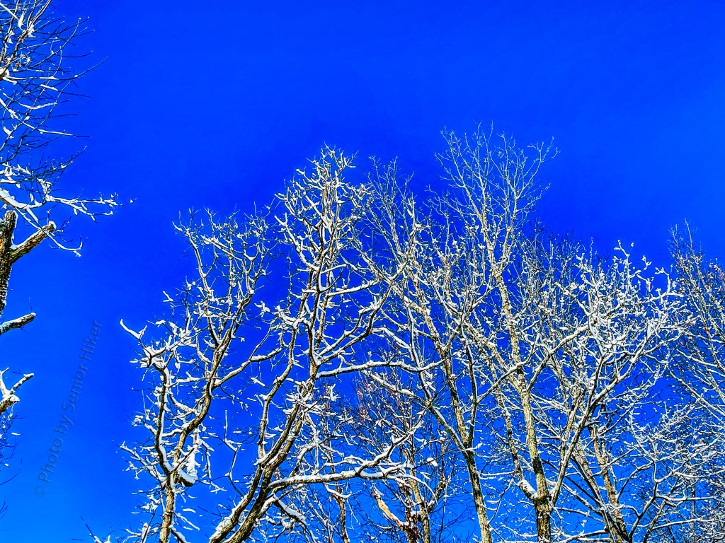After several days of clouds, rain, ice, snow, more clouds and more snow, the sun came out today and the temperature got above freezing. Much of the snow was gone from the trees when I went out to the mailbox, but the trees still looked beautiful against that brilliant blue sky. January 18, 2022.