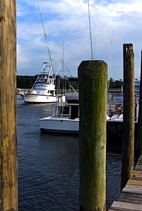 Sport fishing boat pulling into the dock at Calabash, North Carolina. May 7, 2012.